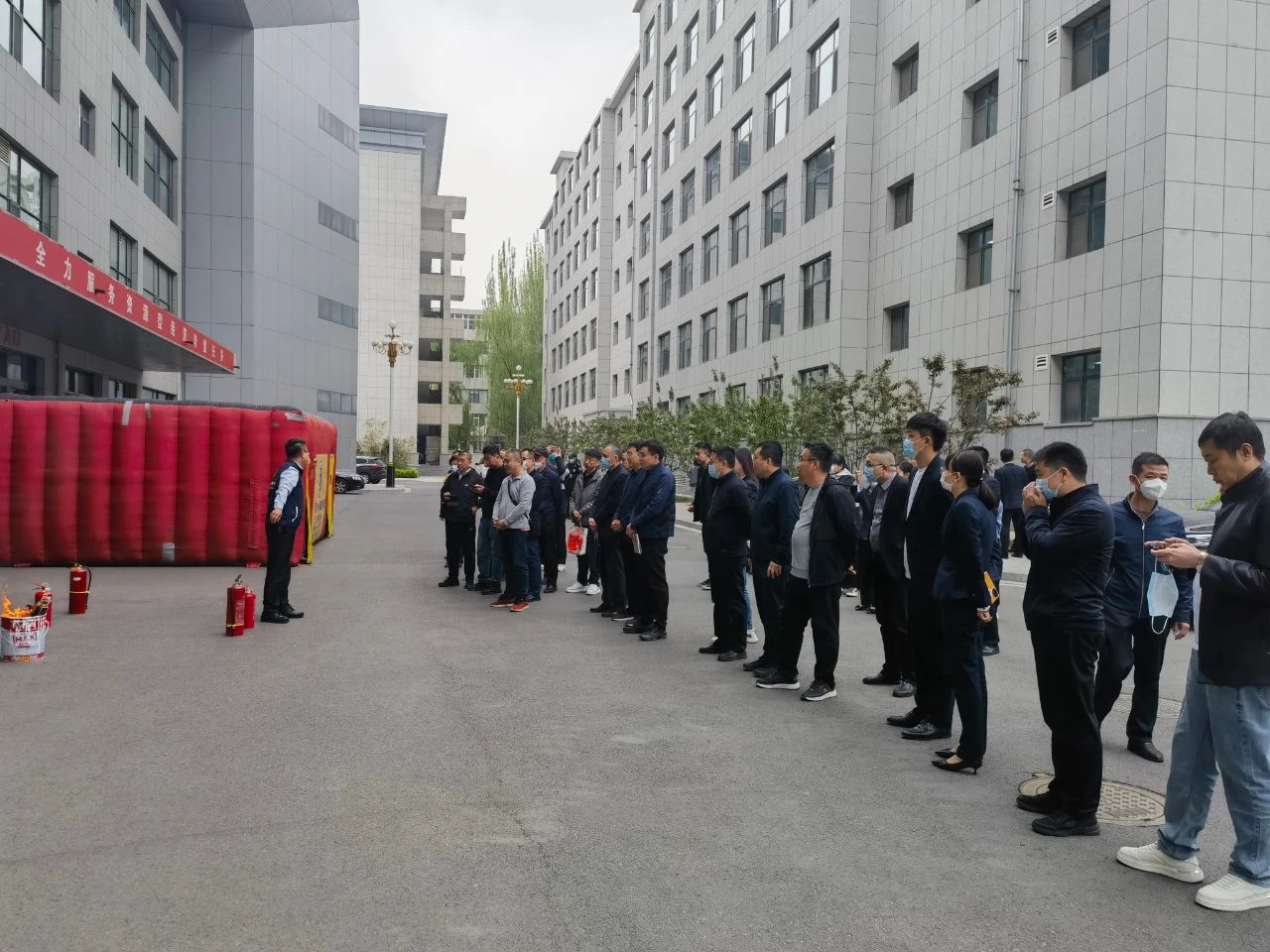 培訓特邀安全健康教育網山西站主任級講師高志明,通過授課+演練相結合的方式進行消防安全培訓。講師以案示警,通過案例分析、現場演示、互動交流,為大家講解了引發火災的多種因素,強調了防火的重要性,普及了消防設備正確的使用方法。在學府辦公區東側食堂門口,參訓人員在講師的指導下,還進行了實操滅火器的使用和消防模擬逃生實戰演練。